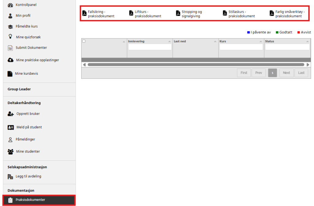 For kurs som krever en praktisk del (for eksempel stillas, lift, fallsikring, anhuking m.m.), må praksisdokumentet lastes opp i portalen.