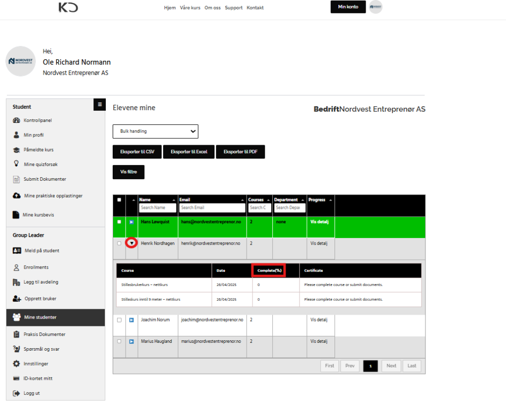 kursconsult admin, kursportal, kursprogresjon, kursstatus, mine studenter
